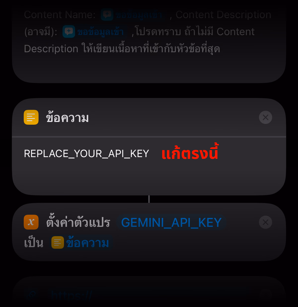 GEMINI_API_KEYถูกตั้งค่าเป็น "ข้อความ" (Text) ที่คุณเพิ่งวางลงไป - กดปุ่ม "เสร็จสิ้น" (Done) ที่มุมขวาบน